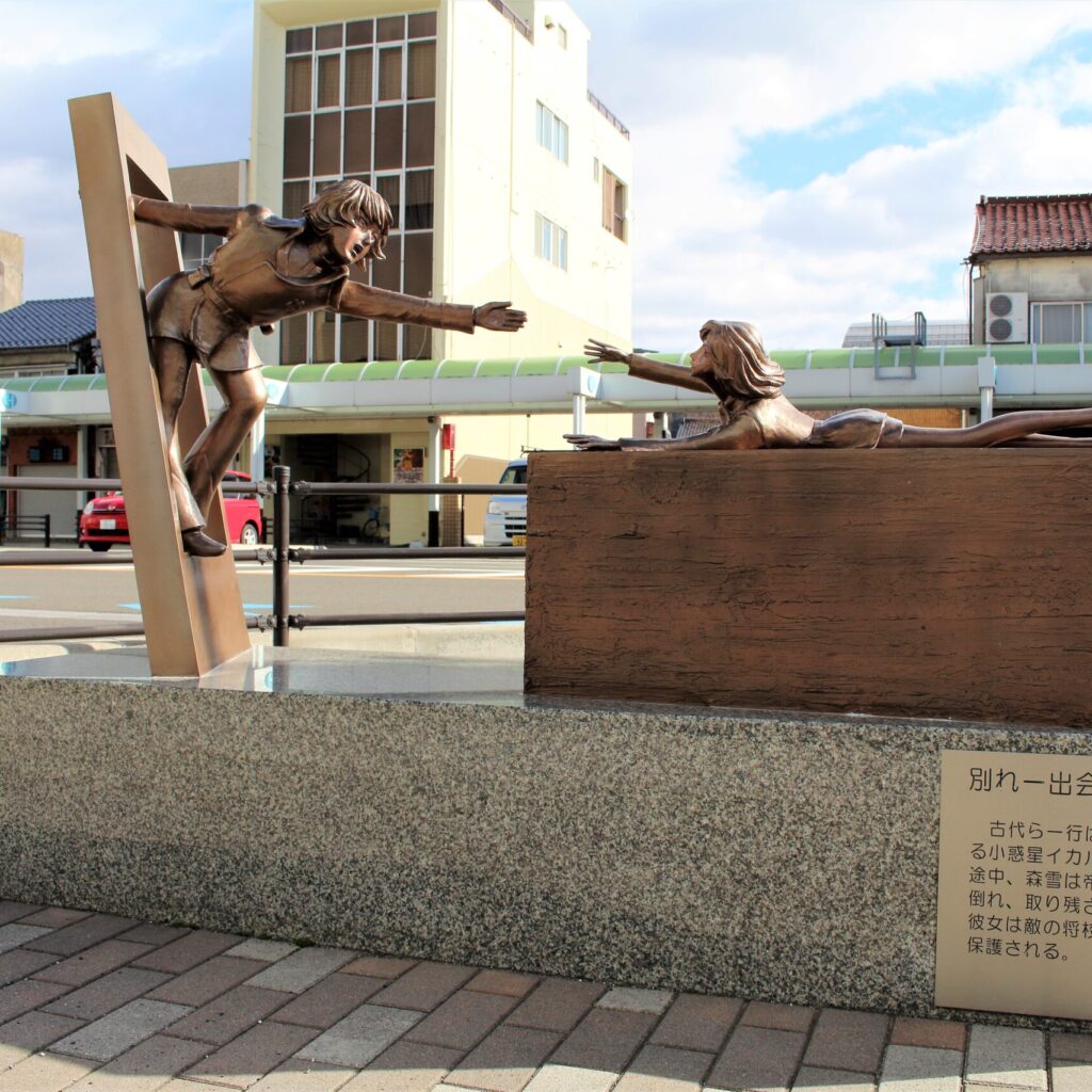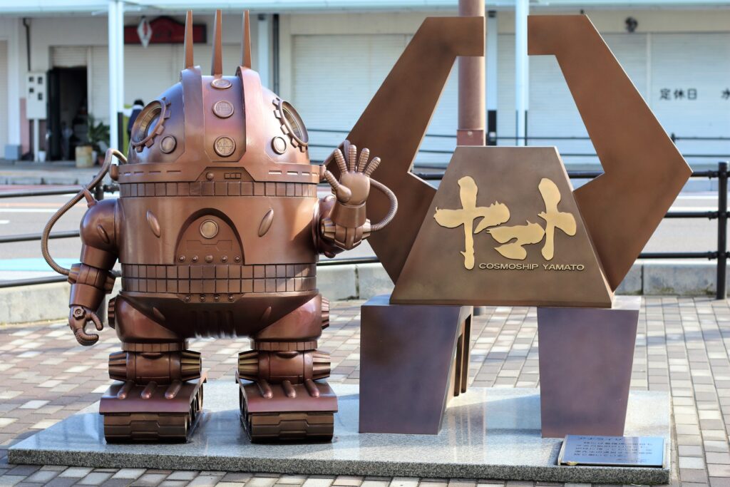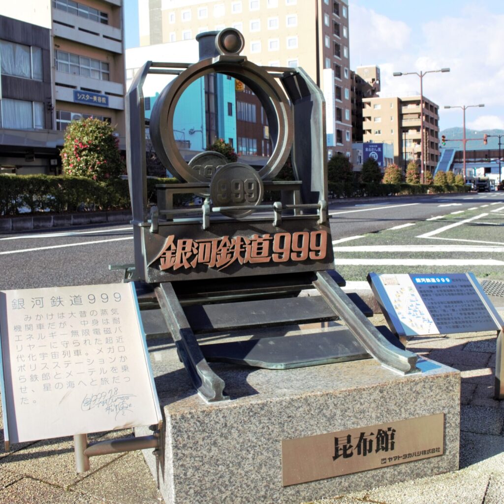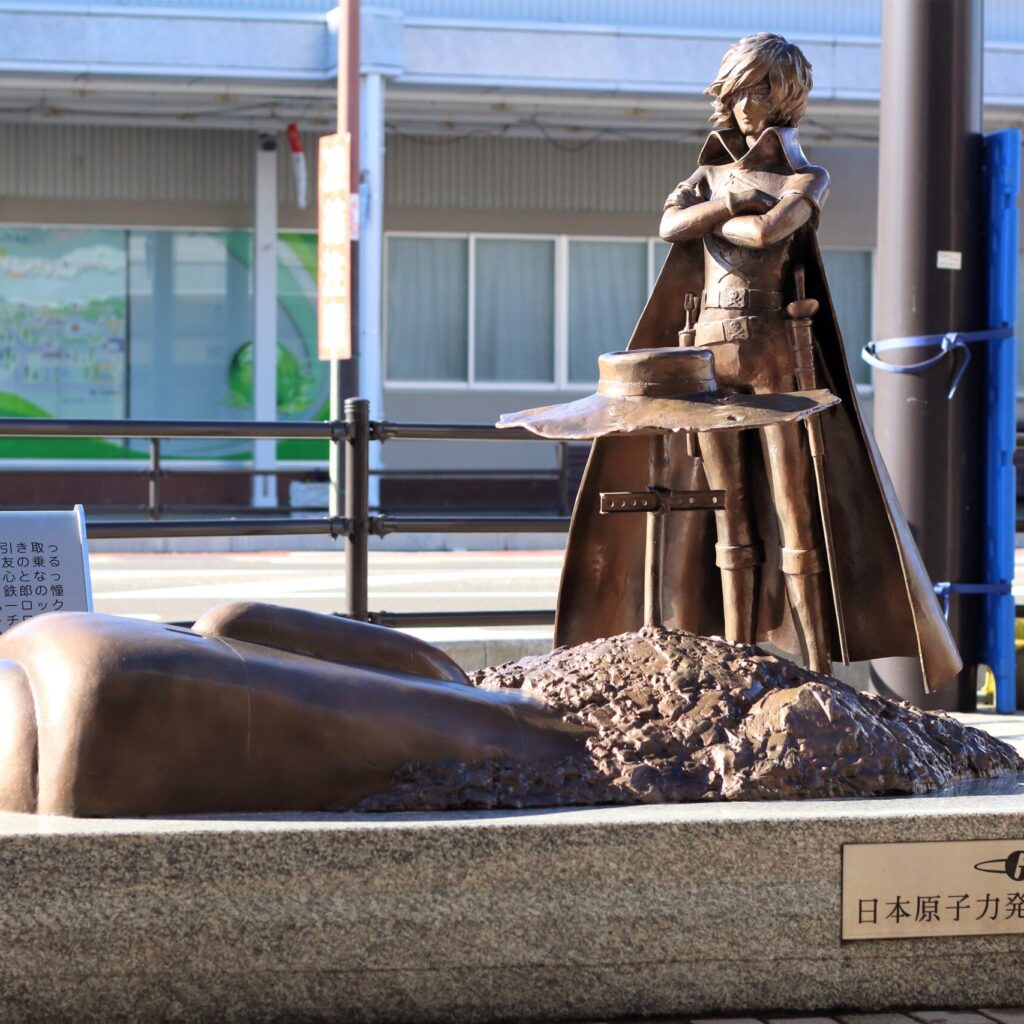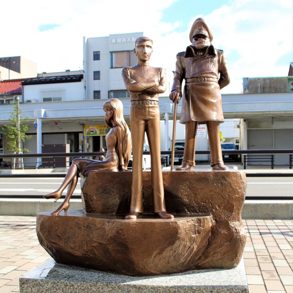 かつては東京とパリを結ぶ「欧亜国際連絡列車」が敦賀港駅を経由して走り、敦賀は「日本でも有数の鉄道と港の町」でした。1999年に敦賀港開港100周年を記念して、市のイメージである「科学都市」「港」「駅」と敦賀市の将来像を重ね合わせて、「宇宙戦艦ヤマト」のブロンズ像12体、「銀河鉄道999」のブロンズ像18体の計28体のモニュメントを敦賀駅から気比神宮までのシンボルロードに設置しました。
