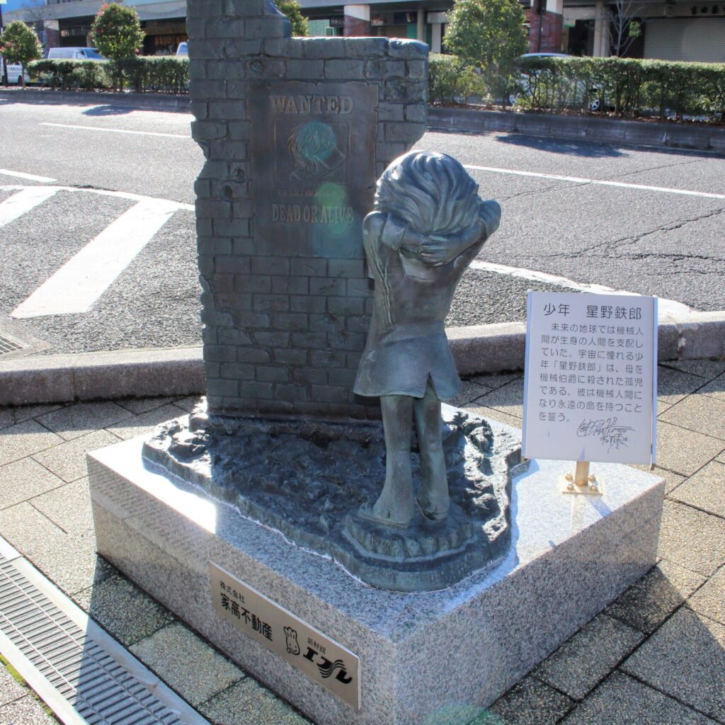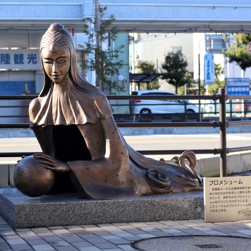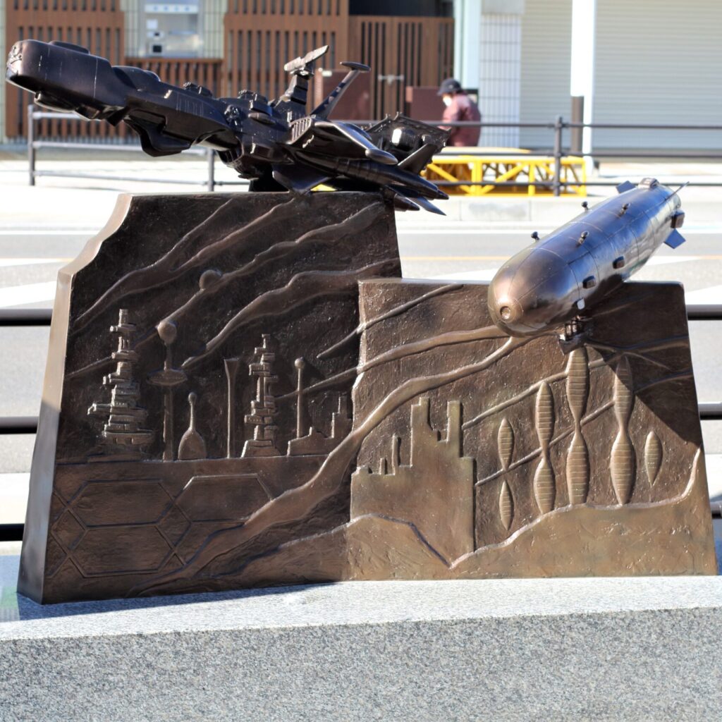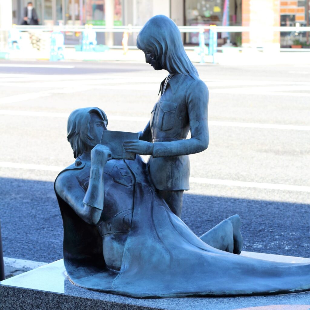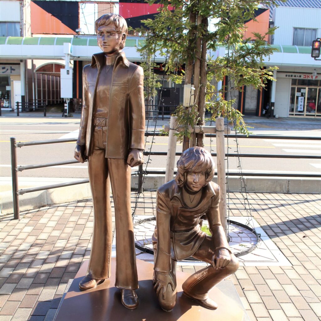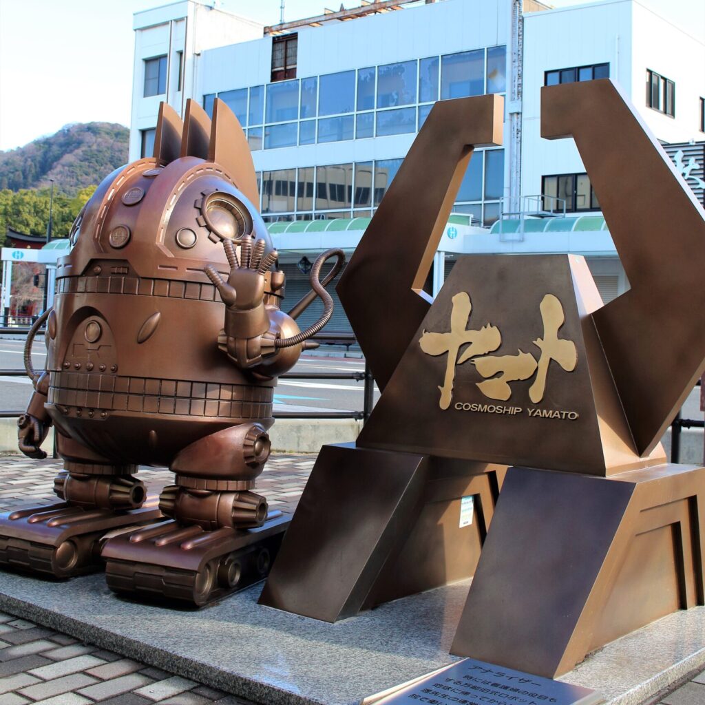 かつては東京とパリを結ぶ「欧亜国際連絡列車」が敦賀港駅を経由して走り、敦賀は「日本でも有数の鉄道と港の町」でした。1999年に敦賀港開港100周年を記念して、市のイメージである「科学都市」「港」「駅」と敦賀市の将来像を重ね合わせて、「宇宙戦艦ヤマト」のブロンズ像12体、「銀河鉄道999」のブロンズ像18体の計28体のモニュメントを敦賀駅から気比神宮までのシンボルロードに設置しました。