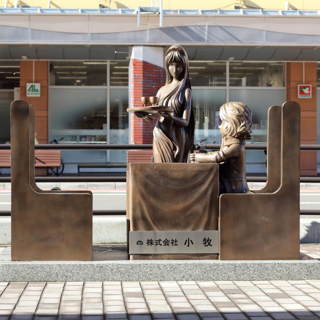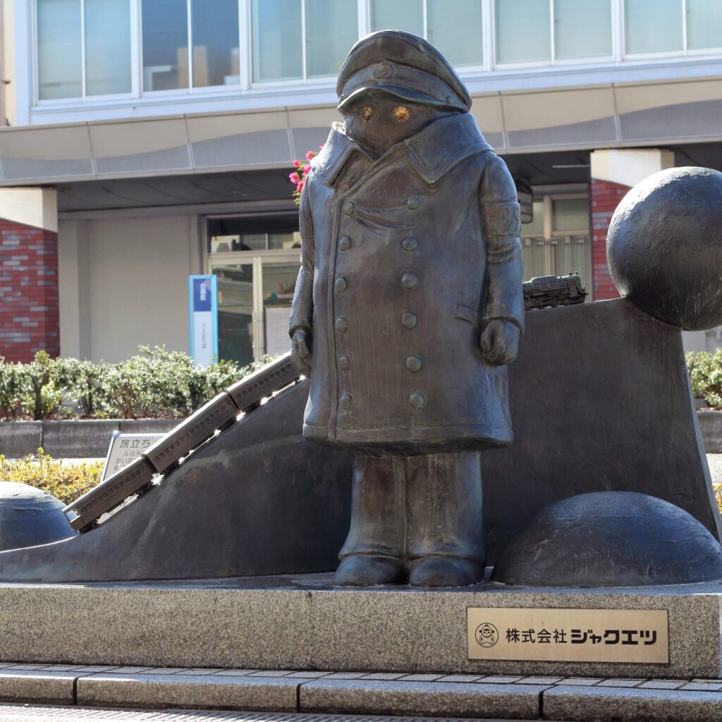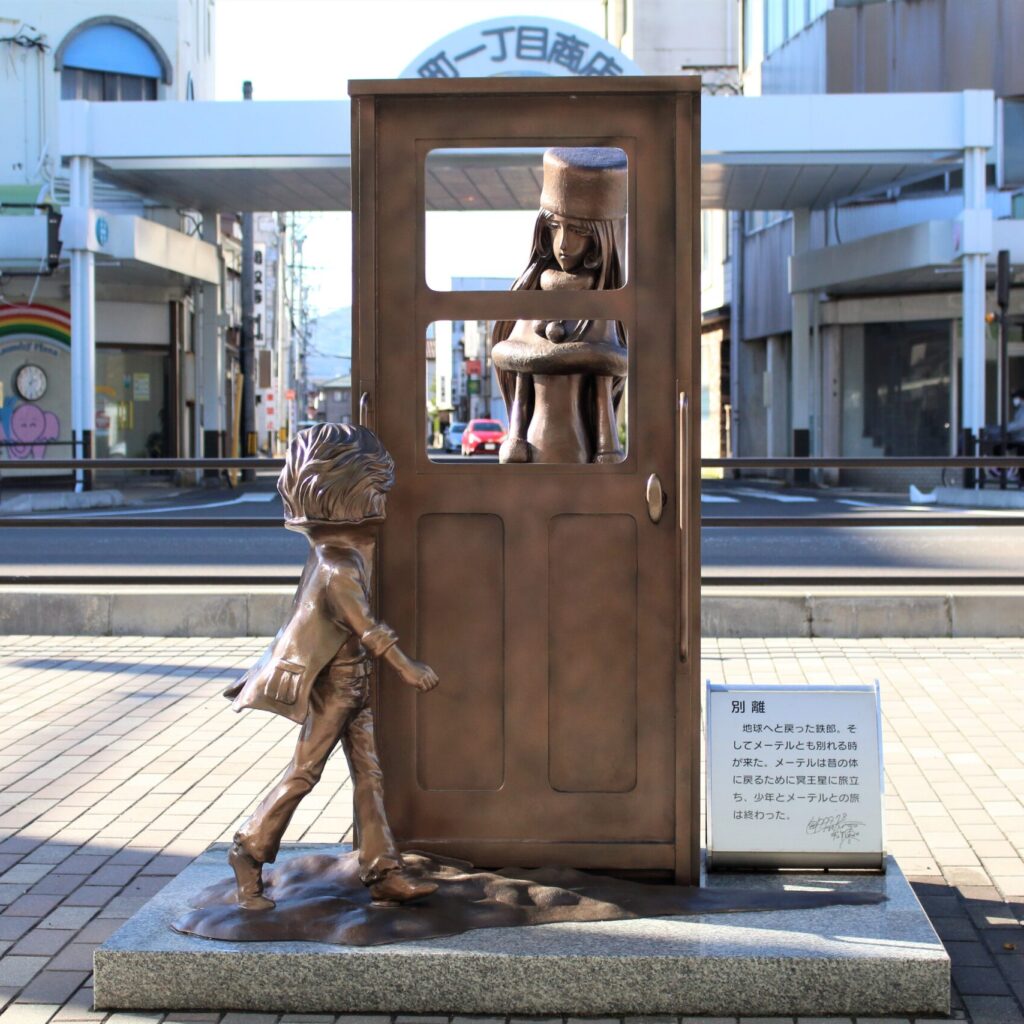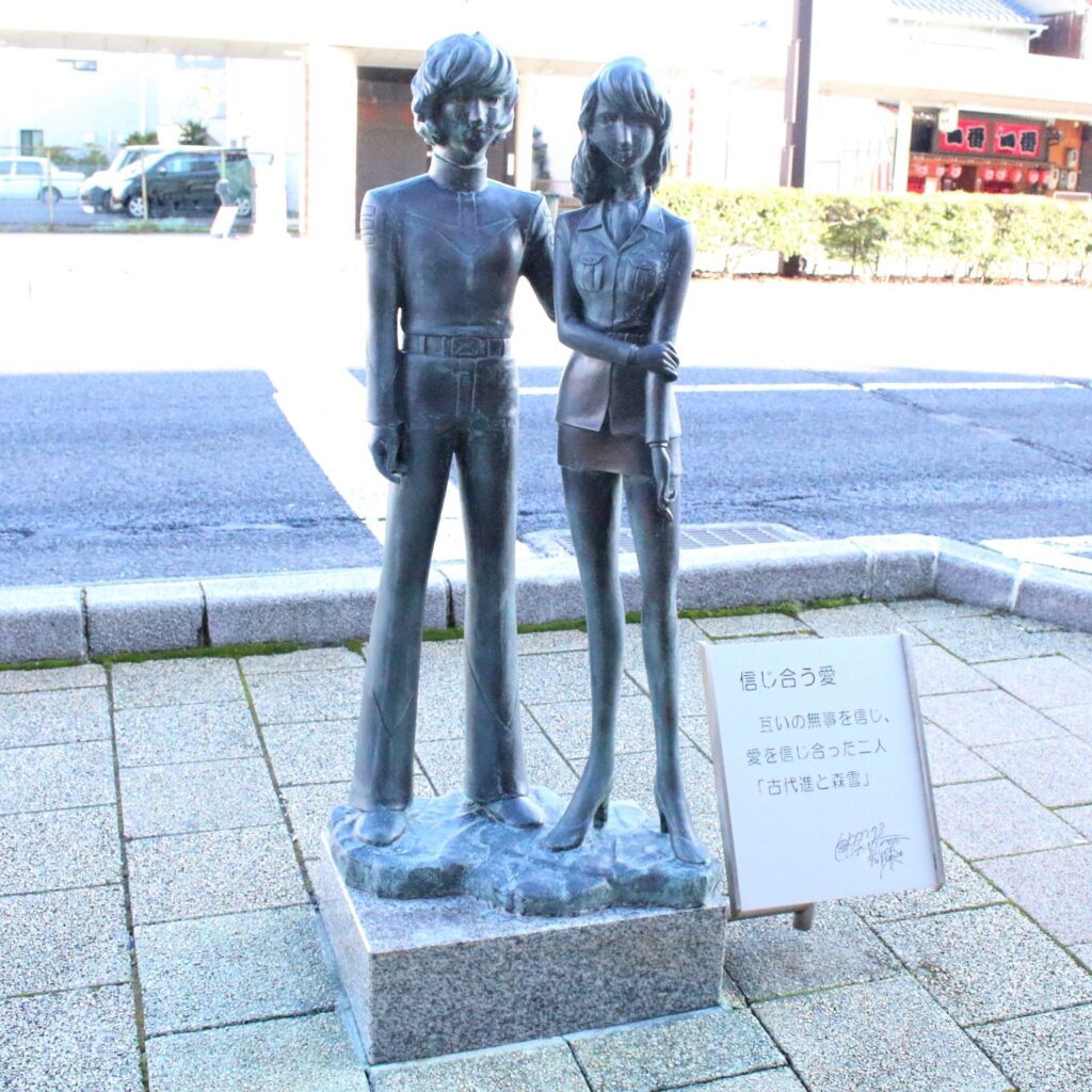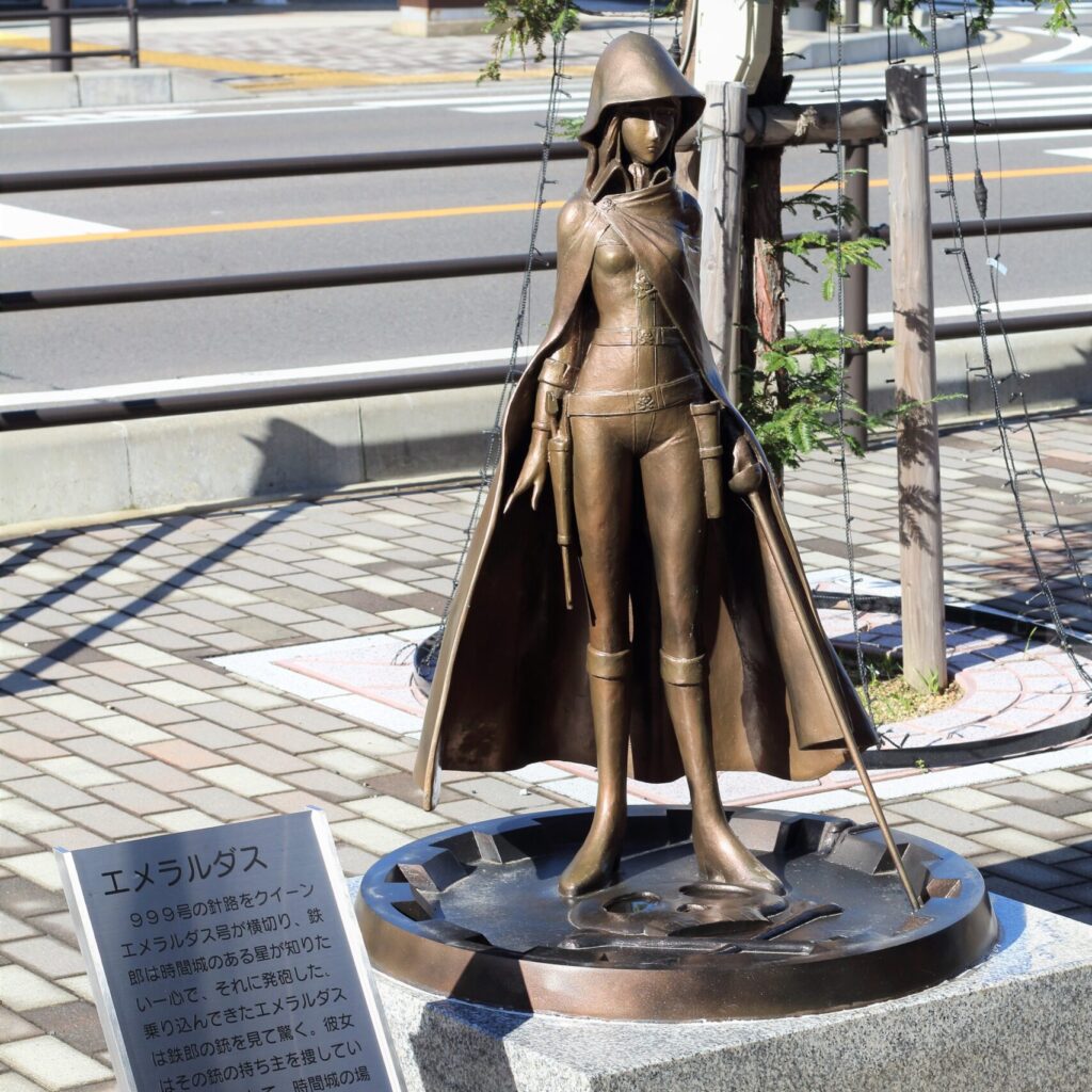 かつては東京とパリを結ぶ「欧亜国際連絡列車」が敦賀港駅を経由して走り、敦賀は「日本でも有数の鉄道と港の町」でした。1999年に敦賀港開港100周年を記念して、市のイメージである「科学都市」「港」「駅」と敦賀市の将来像を重ね合わせて、「宇宙戦艦ヤマト」のブロンズ像12体、「銀河鉄道999」のブロンズ像18体の計28体のモニュメントを敦賀駅から気比神宮までのシンボルロードに設置しました。